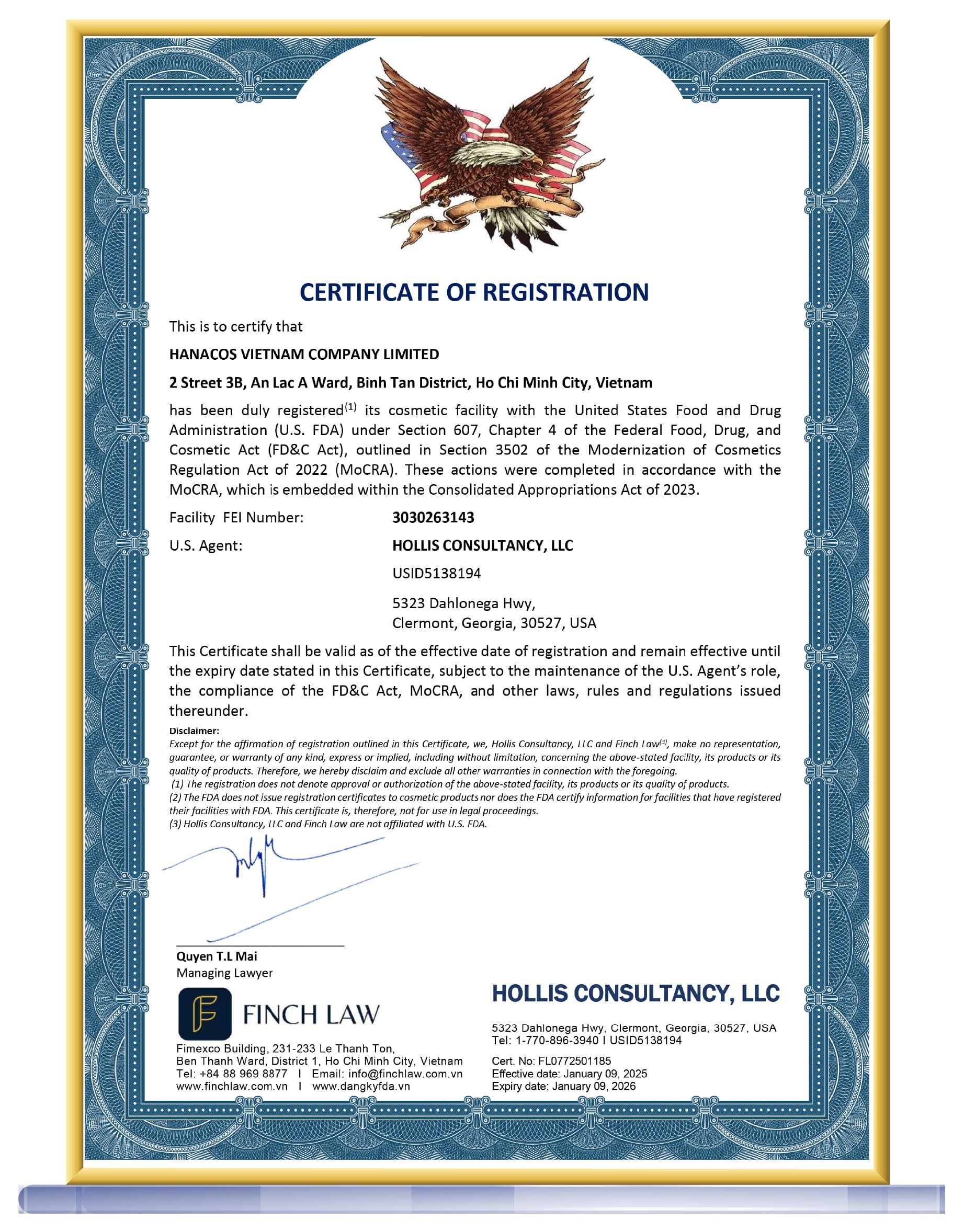 Hanacos Vietnam tự hào là nhà máy sản xuất đạt các chứng nhận quốc tế: cGMP, ISO 9001:2015 , ISO 22716 và FDA